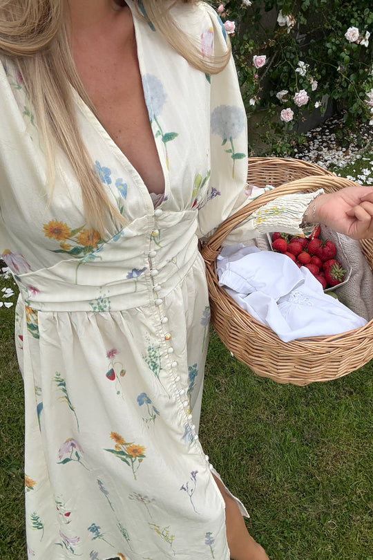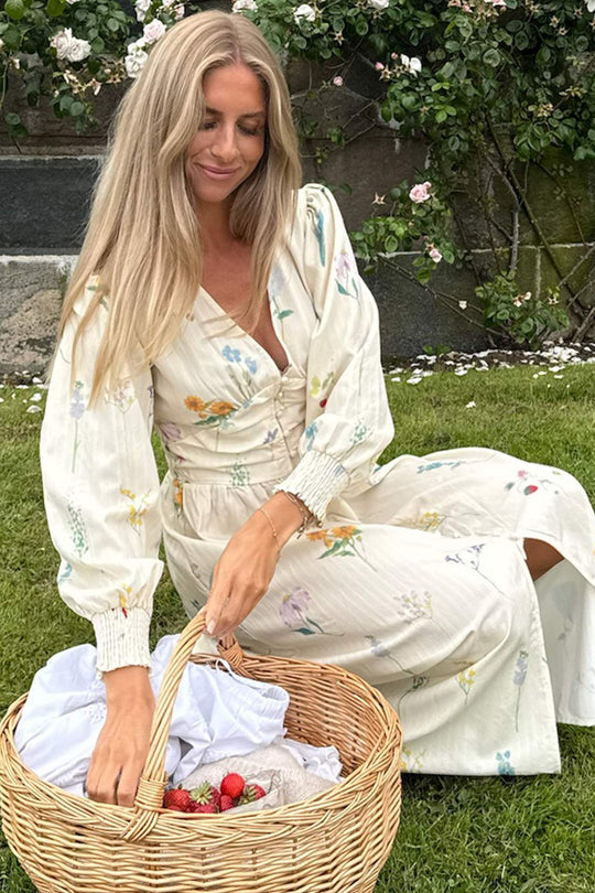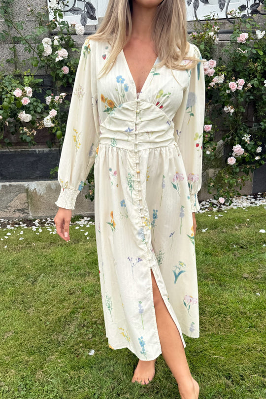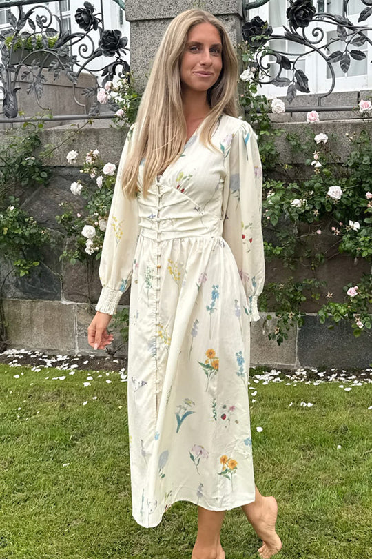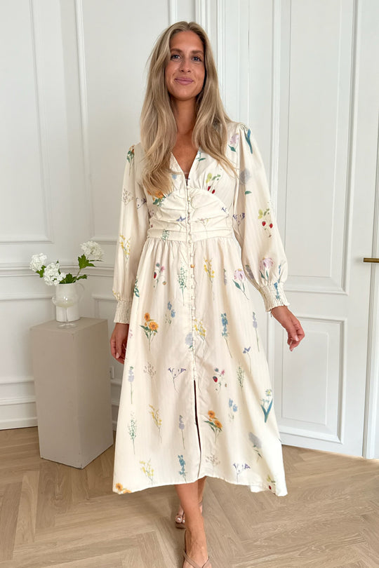 Smuk lang kjole i et off-white blomsterprint med lange ærmer. Kjolen har V-udskæring og knapper hele vejen ned foran for lukning. Den har en tætsiddende silhuet omkring barmen og taljen med en løsere pasform forneden. Ærmerne har elastik i ærmerne, så de kan trækkes op for et kortere look.