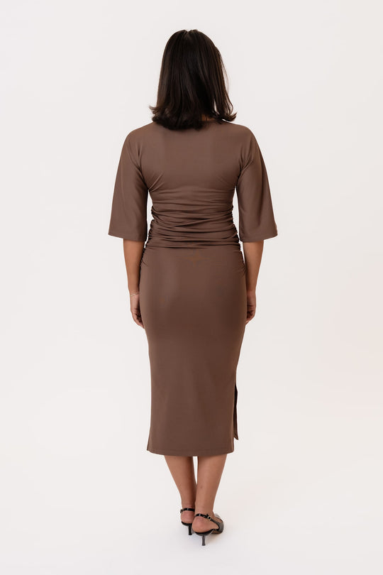 Elegant lang kjole i mørkebrun med en figursyet silhuet. Kjolen har korte ærmer og en rund halsudskæring. Kjolen har flæsedetaljer i siderne og en slids i hver side forneden. Kjolen er lavet af et strækbart materiale.