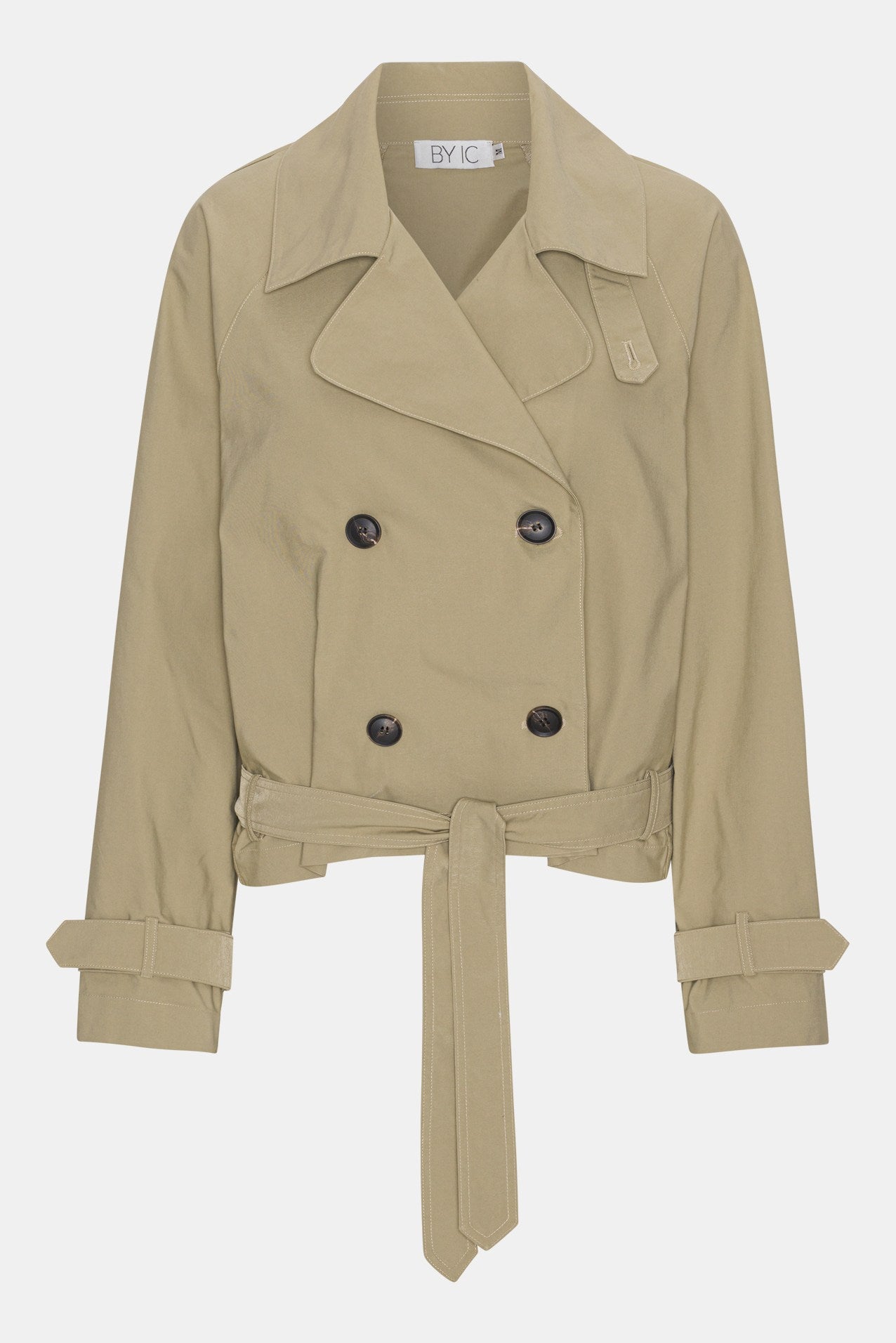Kort trenchcoat i mørk beige med en løs pasform. Trenchcoaten har naturfarvede knapper foran til lukning og stropdetaljer på ærmerne, som også lukkes med en knap. Trenchcoaten har et bindebånd rundt om taljen og lommer.