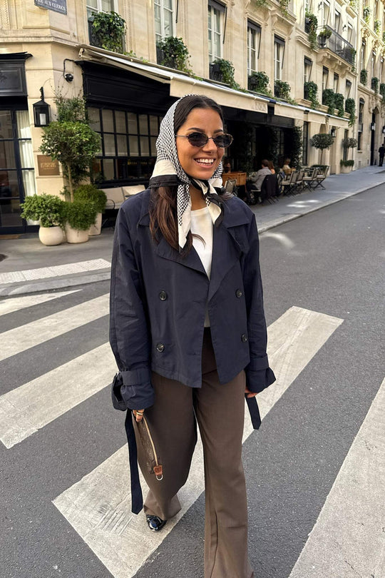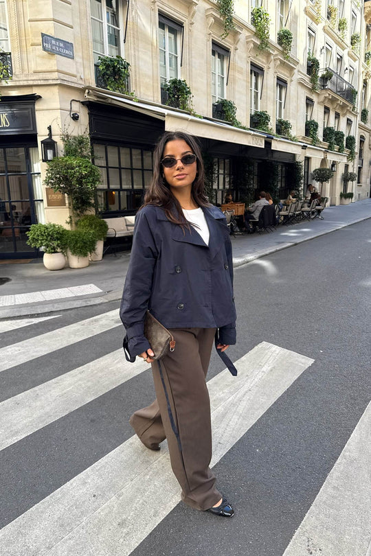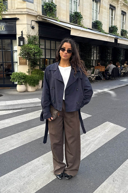 Kort trenchcoat i marineblå med en løs pasform. Trenchcoaten har naturfarvede knapper foran til lukning og stropdetaljer på ærmerne, som også lukkes med en knap. Trenchcoaten har et bindebånd omkring taljen og lommer.