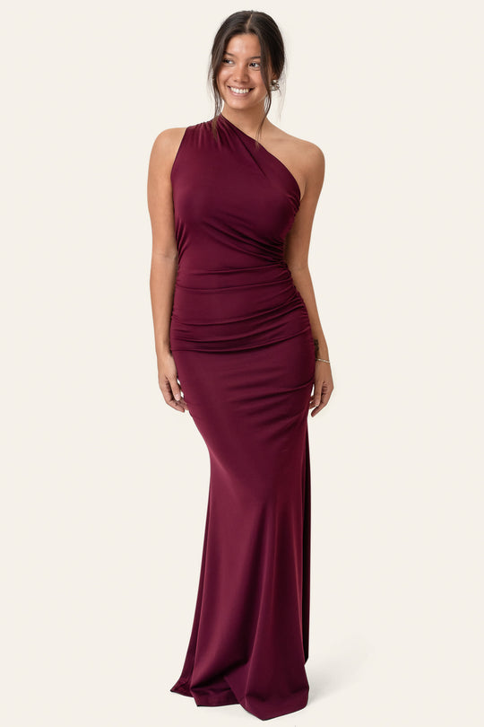 Smuk maxikjole med én skulder i bordeaux. Kjolen er lavet af et dejligt blødt og strækbart stof, der giver den et elegant og figursyet look omkring kroppen, mens A-formen forneden giver den et mere flagrende look. Den har flæsedetaljer langs siden og over skulderen for et feminint touch.