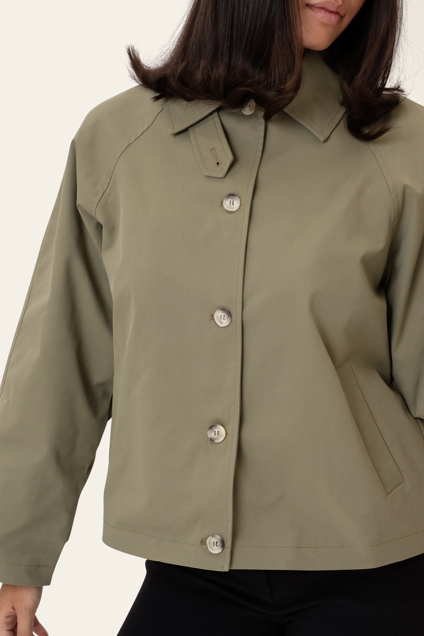 Elegant mørk khaki trenchcoat med løs pasform i kroppen og i ærmerne. Trenchcoaten har en krave, der også kan foldes op med en knap foran, hvilket giver jakken et højhalset look. Den har store naturfarvede knapper ned langs fronten til lukning og stroppedetaljer på ærmerne, der også lukkes med en stor naturfarvet knap. Trenchcoaten har lægdetaljer på bagsiden, hvilket giver jakken et elegant look.