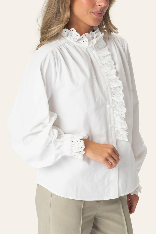 Elegant hvid skjorte med løs pasform omkring kroppen for et afslappet, men raffineret udtryk. Skjorten har lange ærmer med elastiske manchetter, der skaber en let puffet silhuet, afsluttet med fine flæsedetaljer. Den har en rund halsudskæring og knapper hele vejen ned foran. En flæsekant indrammer både halsudskæringen og knaplisten og tilføjer et romantisk og feminint touch.
