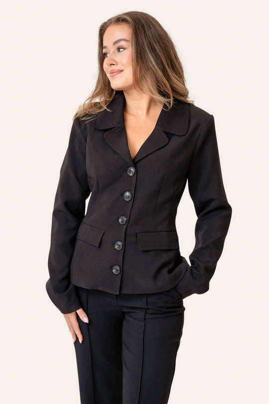 En elegant, tætsiddende blazer i sort. Jakken er designet med en defineret talje, der fremhæver en feminin silhuet og skaber et sofistikeret, skræddersyet look. Den har en klassisk krave, dekorative syninger og lukning foran med iøjnefaldende naturtonede knapper, der giver et eksklusivt touch. Foran har blazeren to klaplommer og en let afrundet kant, der skaber den perfekte balance mellem klassisk og moderne stil. Det bløde, strukturerede stof gør den behagelig at have på, samtidig med at den bevarer sin smukke form. Style den med de matchende SignatureIC-bukser for et komplet, tidløst sæt – perfekt til kontoret, middagen eller begivenheder, hvor du ønsker et poleret og feminint look.