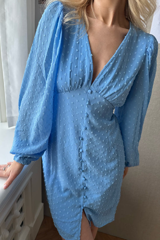 Sød blå kjole med små prikker, en feminin v-udskæring og knapper ned lang fronten af kjolen.