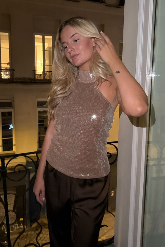 En glitrende halterneck-top i en smuk lysebrun nuance, fuldt udsmykket med glitrende pailletter. Toppen har en elegant, tætsiddende silhuet med en blødt draperet effekt, der flatterer kroppen smukt. Den høje halsudskæring lukkes bagpå med to fine knapper, der tilføjer et raffineret finish og sikrer en perfekt pasform. Den åbne ryg fremhæver det elegante, feminine look, mens det bløde, strækbare stof giver komfort og ubesværet glamour. Kombiner den med den matchende paillettenederdel for et komplet festsæt, eller style den med sorte bukser for en chik og moderne kontrast.