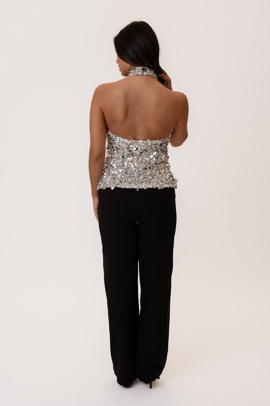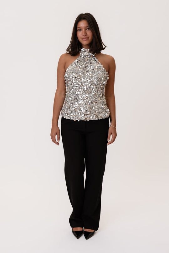 En iøjnefaldende halterneck-top dækket af glitrende sølvpailletter, der smukt reflekterer lyset og skaber et luksuriøst festlook. Toppen har en elegant høj halsudskæring og en flatterende, tætsiddende silhuet, der fremhæver figuren. Den åbne ryg tilføjer et sofistikeret og sensuelt touch, hvilket gør den ideel til særlige lejligheder. Den er foret for ekstra komfort og har en let stretch for at sikre en perfekt pasform. Lukningen med to knapper i nakken giver et rent og stilfuldt finish. Style den med den matchende paillettenederdel for et komplet, glamourøst sæt – eller kombiner den med sorte bukser og hæle for et elegant og moderne aftenlook.