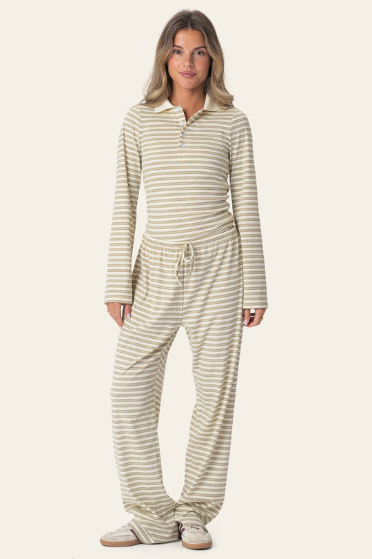 Bukser i gule striber lavet af blødt materiale. De har en løs pasform og et bindebælte i taljen for justerbar komfort og stil. Bukserne er lavet af et strækbart materiale.
