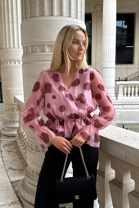 En smuk bluse i pink med et rødt blomsterprint. Blusen har en afslappet pasform med en defineret talje, lange ærmer og en dyb V-udskæring med en slå-om-detalje og fine flæser. De lange ærmer er afsluttet med elastiske manchetter, der skaber en diskret flæse og giver ærmerne en blødt pufet silhuet. Blusen har et bindebælte, der kan bæres i taljen eller styles som et halstilbehør for et ekstra touch.