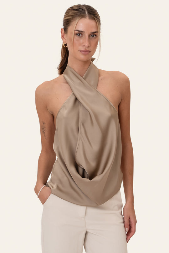 En elegant halterneck-top fremstillet af skinnende satin med en smukt draperet front. Det brede bindebånd i halsen skaber et sofistikeret look, og den åbne ryg giver et feminint og raffineret touch. Det bløde satinstof har en let stretch for en flatterende pasform og en luksuriøs følelse mod huden. Perfekt til både særlige lejligheder og elegante hverdagslooks – style den med skræddersyede bukser eller en nederdel for et moderne og tidløst outfit.