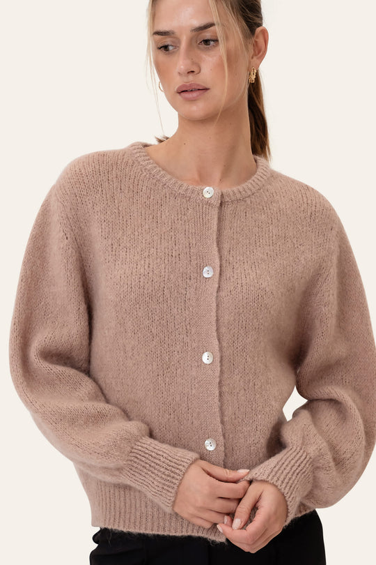 En smuk, blød mohaircardigan i mørk beige. Cardiganen har lange ærmer med brede, tætsiddende ribkanter, der giver ærmerne et blødt pufet look. En matchende bred ribkant findes også forneden og omkring den runde halsudskæring, hvilket skaber en voluminøs silhuet, når cardiganen knappes op. Den lukkes foran med elegante, perlelignende knapper for et raffineret touch.