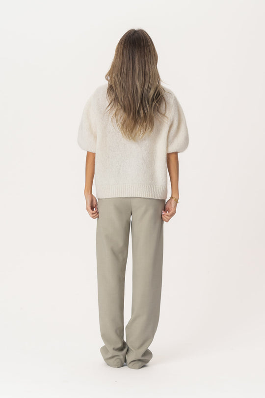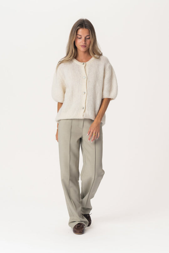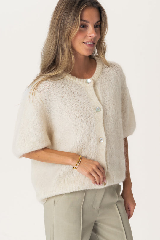 Smuk, fuzzy mohair-cardigan i hvid. Cardiganen har korte ærmer, der afsluttes med tætsiddende ribkanter, som giver ærmerne et let puffet udtryk. En tilsvarende ribkant findes ved sømmen og rundt om den runde halsudskæring, hvilket skaber en voluminøs silhuet, når cardiganen er knappet. Den lukkes foran med elegante knapper med perlemorslook for et raffineret finish.