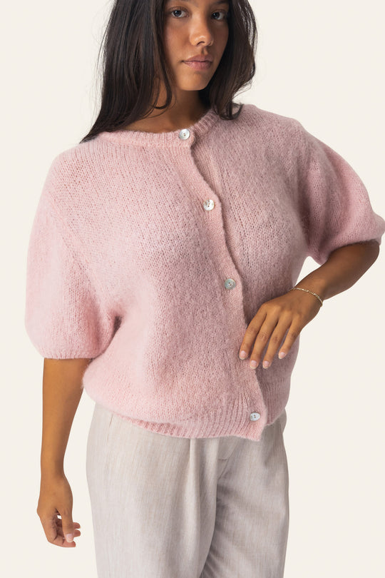 En smuk, blød mohaircardigan i lyserød. Cardiganen har korte ærmer med tætsiddende ribkanter, der giver ærmerne et blødt pufet look. En matchende bred ribkant findes også forneden og omkring den runde halsudskæring, hvilket skaber en voluminøs silhuet, når cardiganen knappes op. Den lukkes foran med elegante, perlelignende knapper for et raffineret touch.