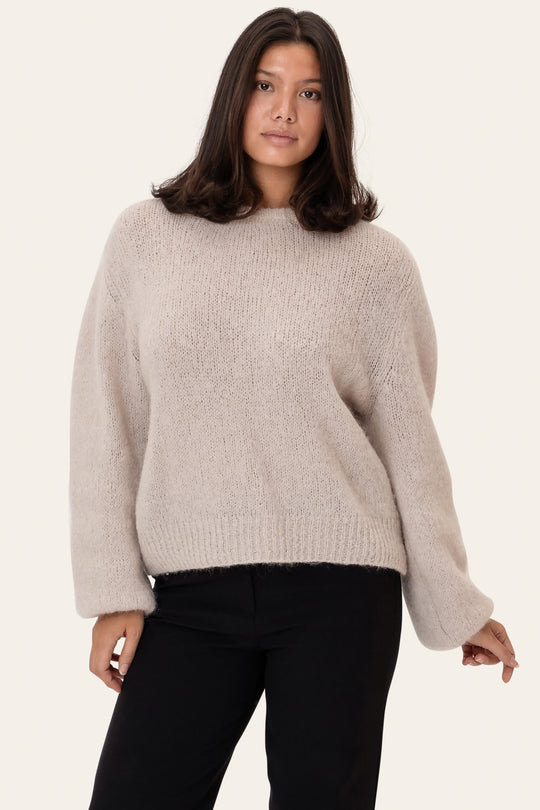 En blød og luftig strik i en smuk beige nuance, der udstråler femininitet og hygge. Designet med en afslappet pasform, rund halsudskæring og let ballonformede ærmer, der skaber et elegant fald og en ubesværet silhuet. Fremstillet af et let og luftigt materiale, der føles blidt mod huden og holder dig varm uden at være tungt. Perfekt at style med jeans, nederdele eller lag på lag over kjoler – et alsidigt essentielt element i garderoben.