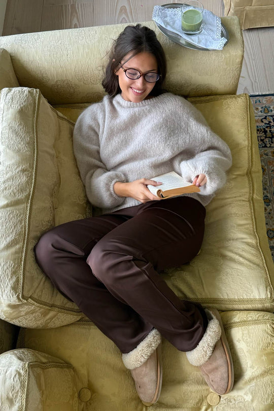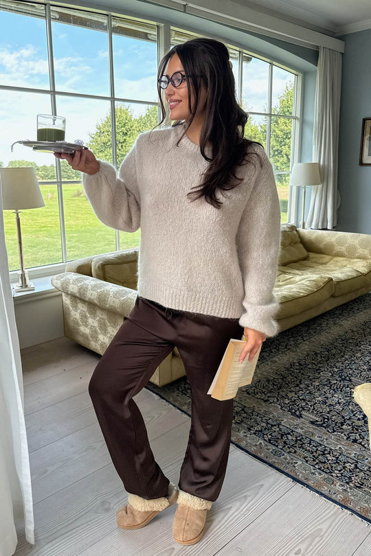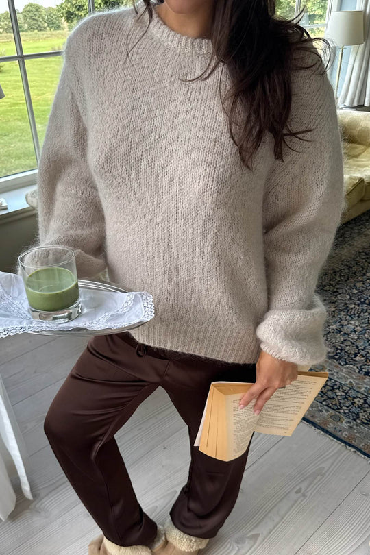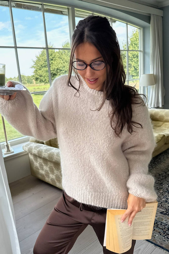 Fuzzy mohair pullover med lange ærmer, let puffede af smalle ribkanter ved ærmerne. Strikningen har en rund halsudskæring og fin ribkant ved både kanten og kraven for et raffineret look.
