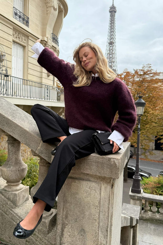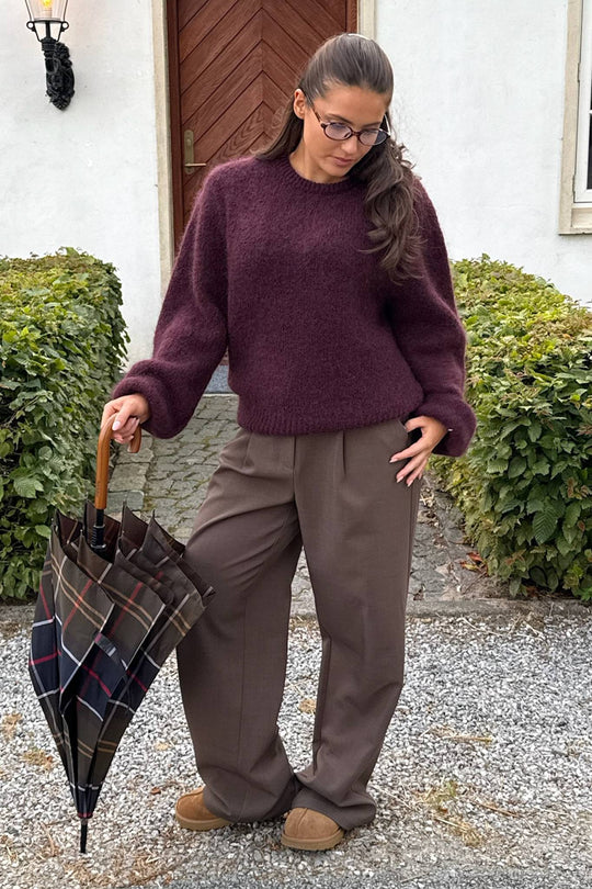 En smuk, flot mohair-pullover i bordeaux. Cardiganen har lange ærmer med tætsiddende ribkanter, der giver ærmerne et blødt pufet look. En matchende ribkant findes også forneden og omkring den runde halsudskæring, hvilket skaber en voluminøs silhuet.