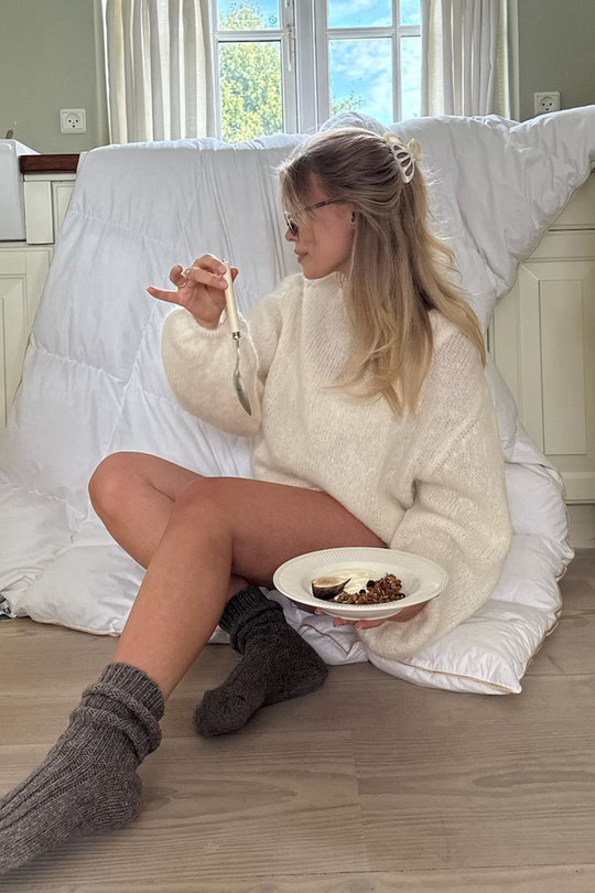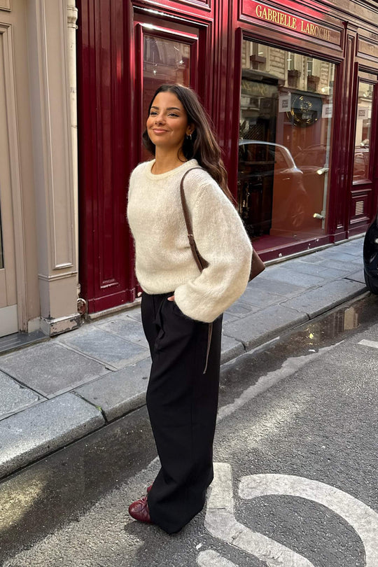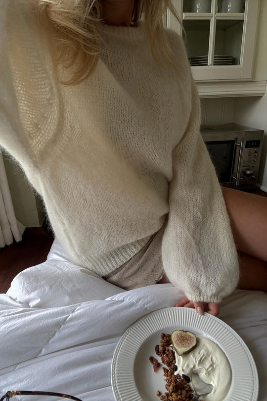 En smuk, blød mohair-pullover i hvid. Cardiganen har lange ærmer med tætsiddende ribkanter, der giver ærmerne et blødt, pufet look. En matchende ribkant findes også forneden og omkring den runde halsudskæring, hvilket skaber en voluminøs silhuet.