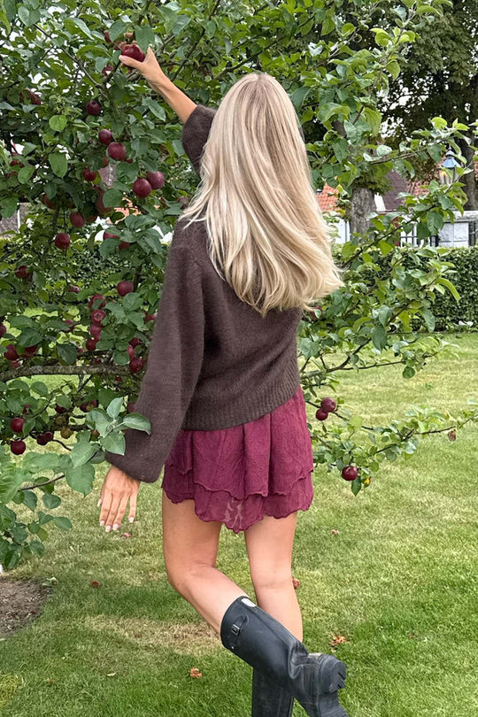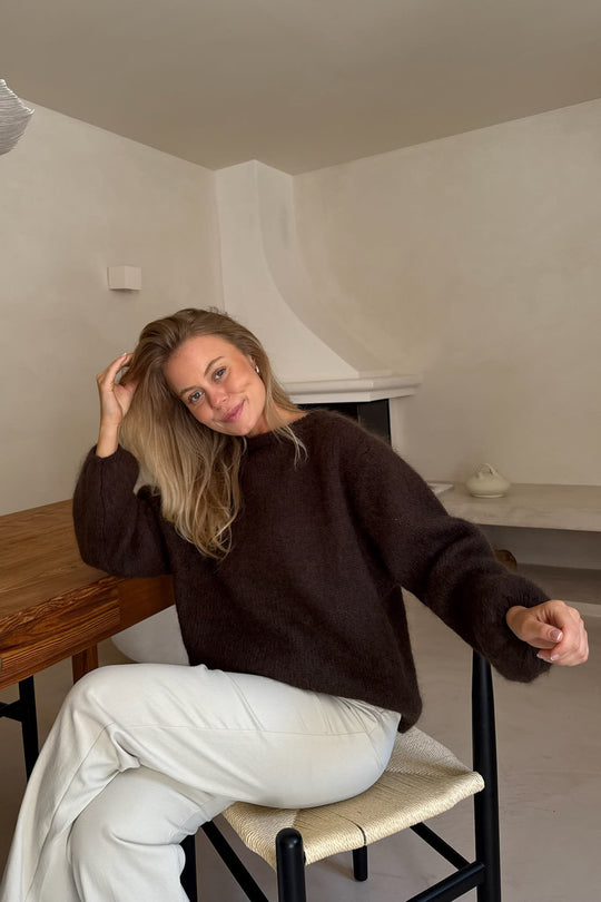 En smuk, blød mohair-pullover i mørkebrun. Cardiganen har lange ærmer med tætsiddende ribkanter, der giver ærmerne et blødt pufet look. En matchende ribkant findes også forneden og omkring den runde halsudskæring, hvilket skaber en voluminøs silhuet.