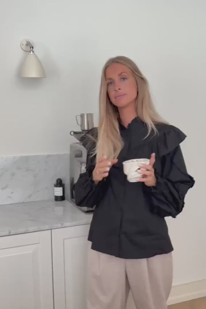 Sort skjorte med flæsedetaljer både foran og bagpå skjorten og knaplukning gennem skjorten.