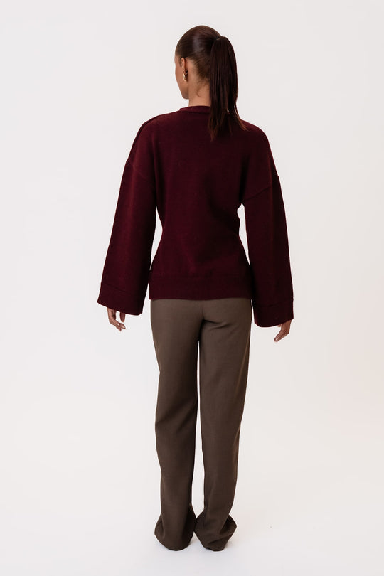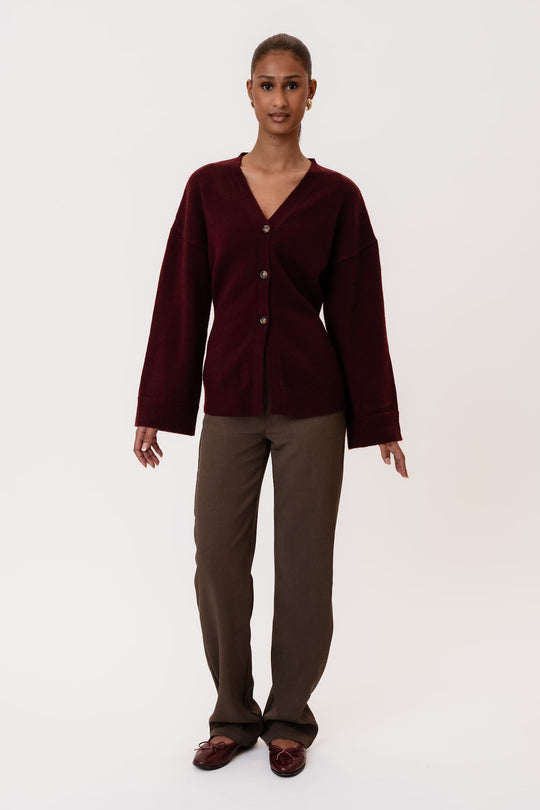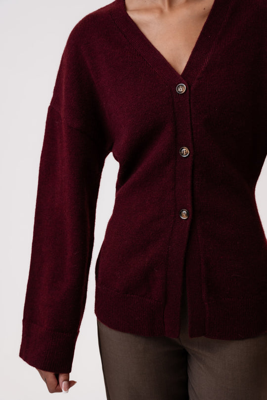 Blød tætsiddende cardigan i uldblanding med ribdetaljer. Den har brede ærmer og 3 knapper som lukning.