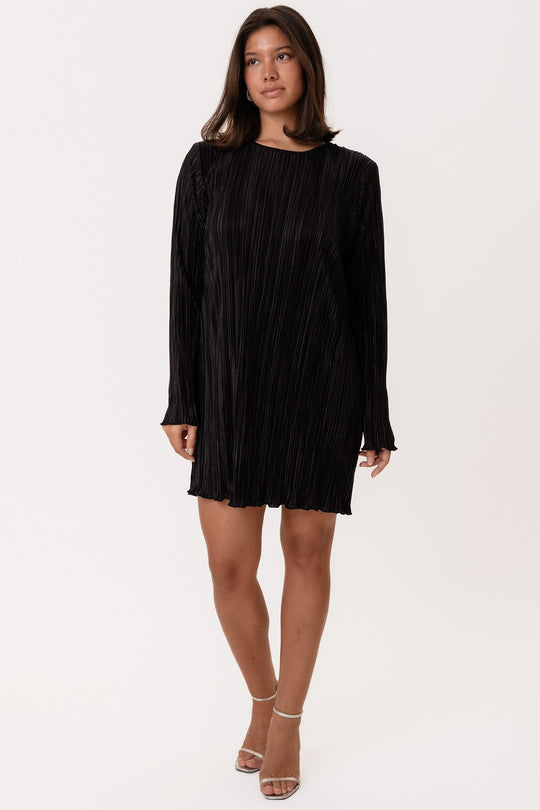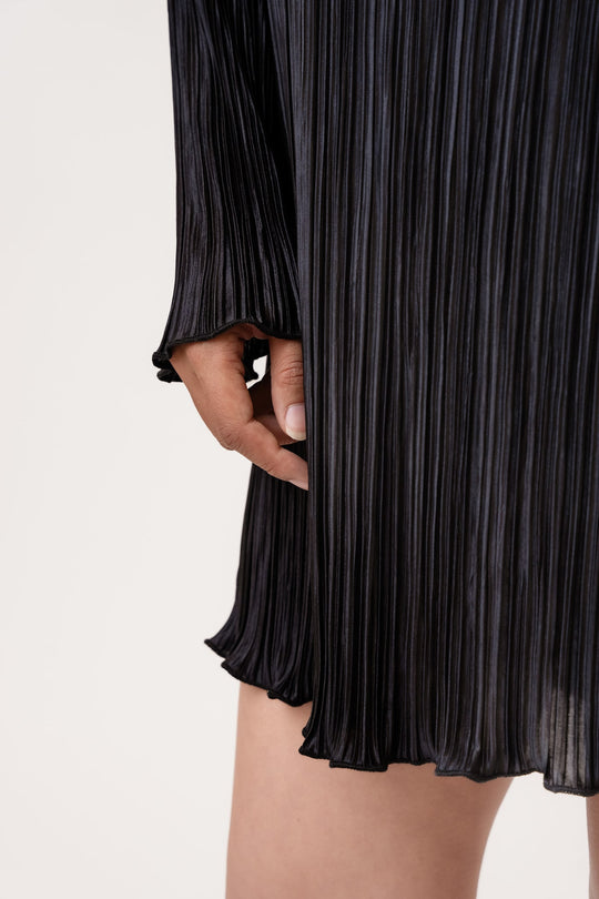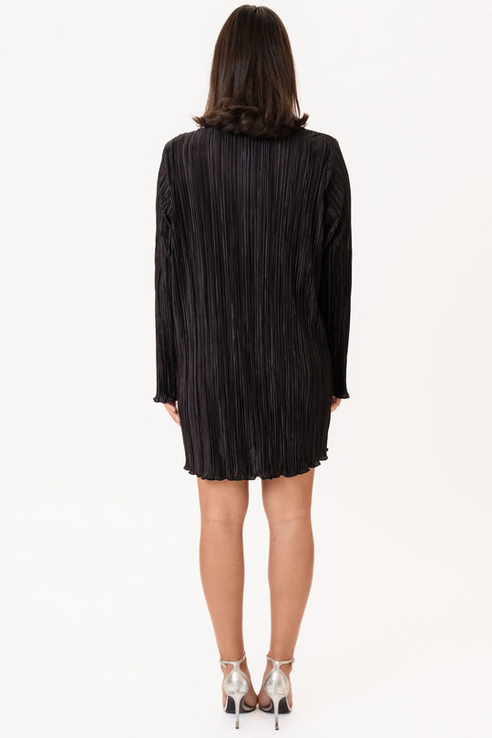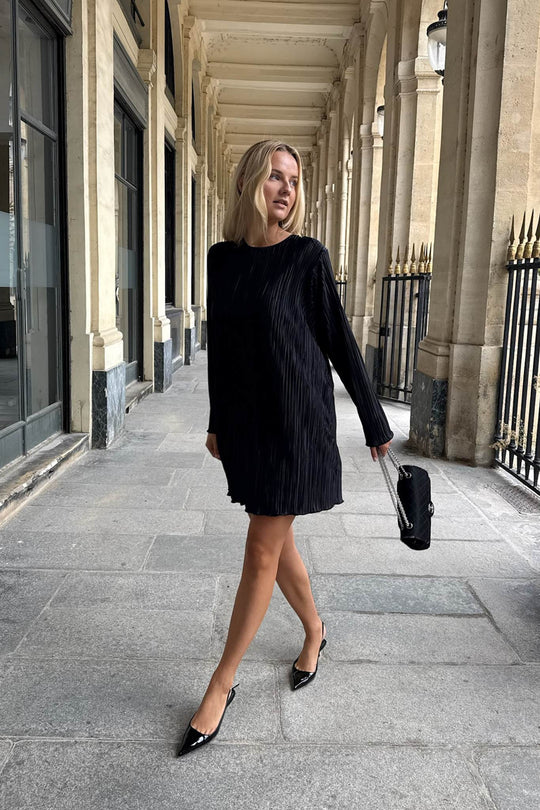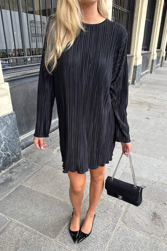 Kort plissé kjole i sort med lange ærmer, små skulderpuder og har en rummelig fitting.
