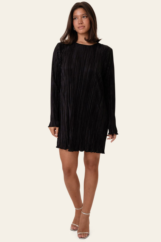 En elegant sort kjole fremstillet af et smukt plisseret stof, der bevæger sig yndefuldt og udstråler sofistikering. Kjolen har en lige, afslappet silhuet, der falder ubesværet langs kroppen og giver et moderne og raffineret look. Diskrete skulderpuder tilføjer en subtil struktur til designet og giver det en ophøjet og selvsikker form. De lange ærmer afsluttes i blødt, bølgede kanter, der fremhæver kjolens feminine flow. De let glitrende læg fanger lyset smukt, hvilket gør denne kjole perfekt til både særlige lejligheder og elegant hverdagsbrug. Style den med hæle og en clutch for et tidløst aftenlook eller med flade sko for et chikt og underspillet outfit.
