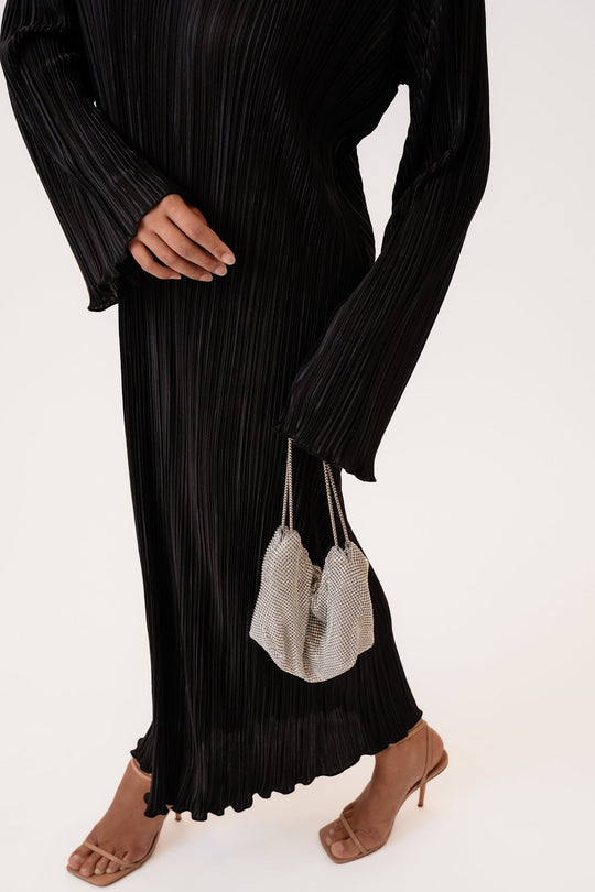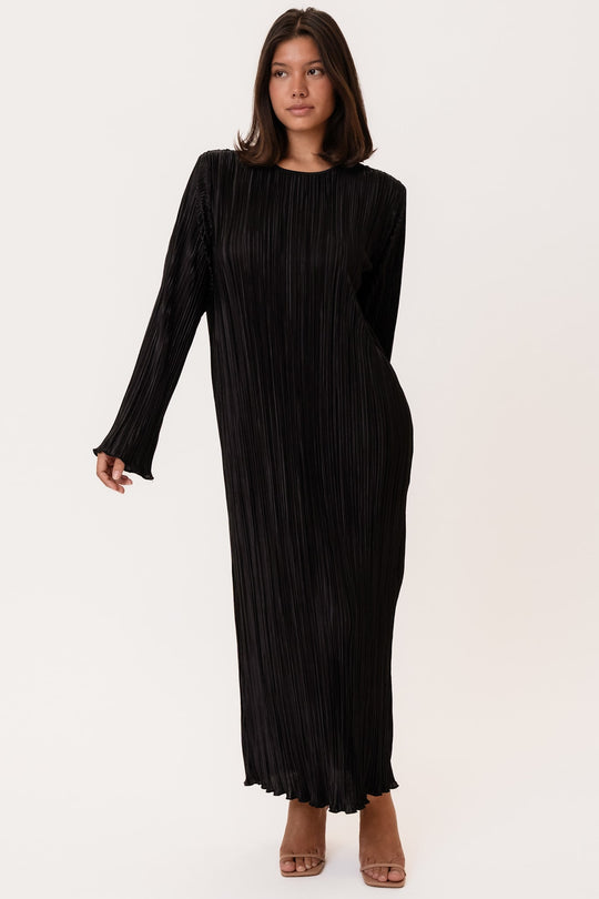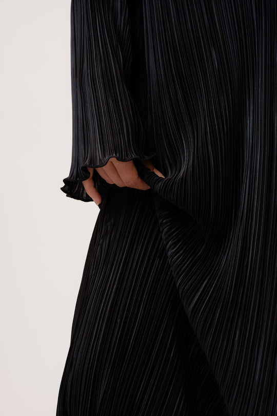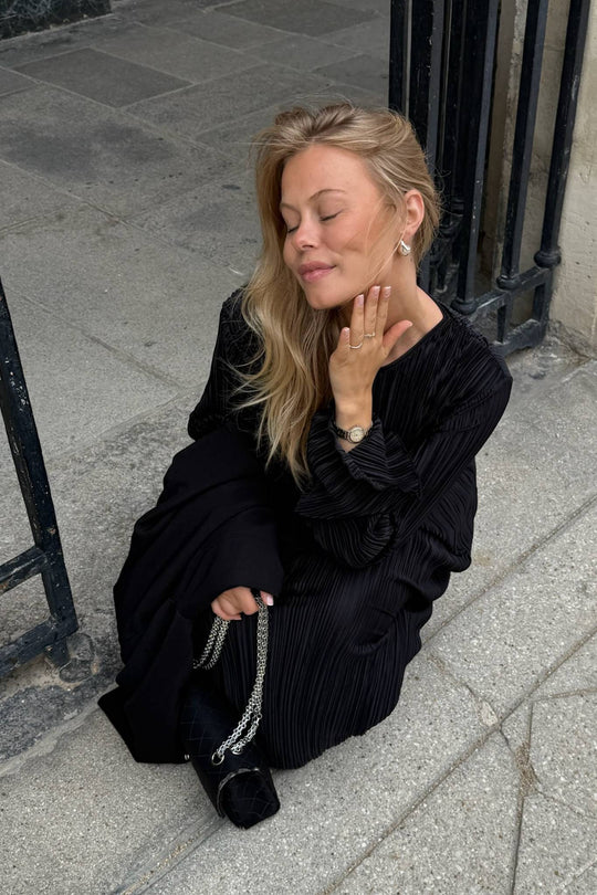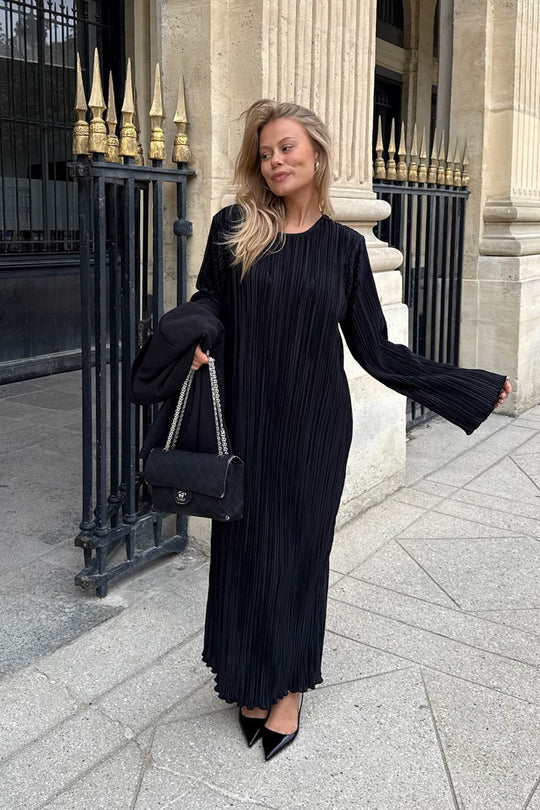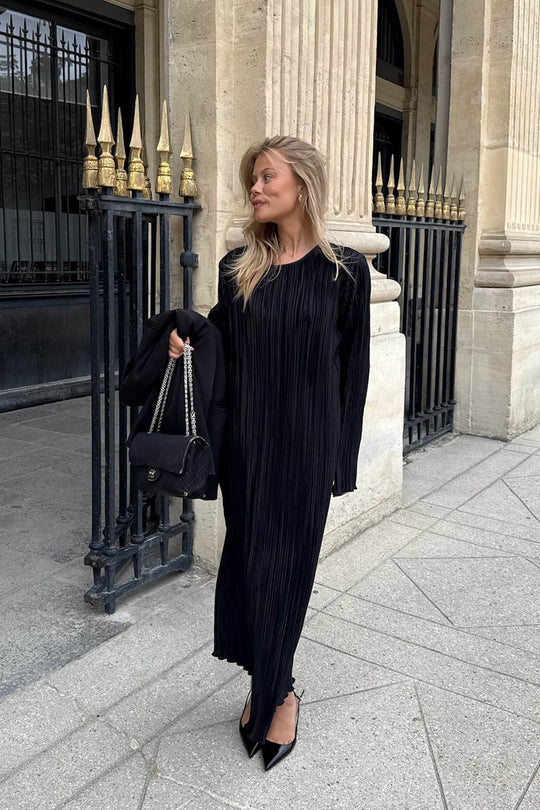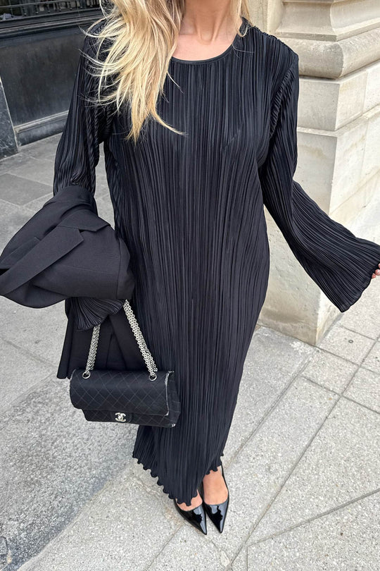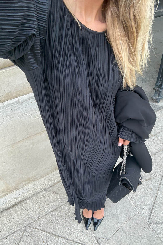 Lang plissé kjole i sort med lange ærmer, små skulderpuder og har en rummelig fitting.