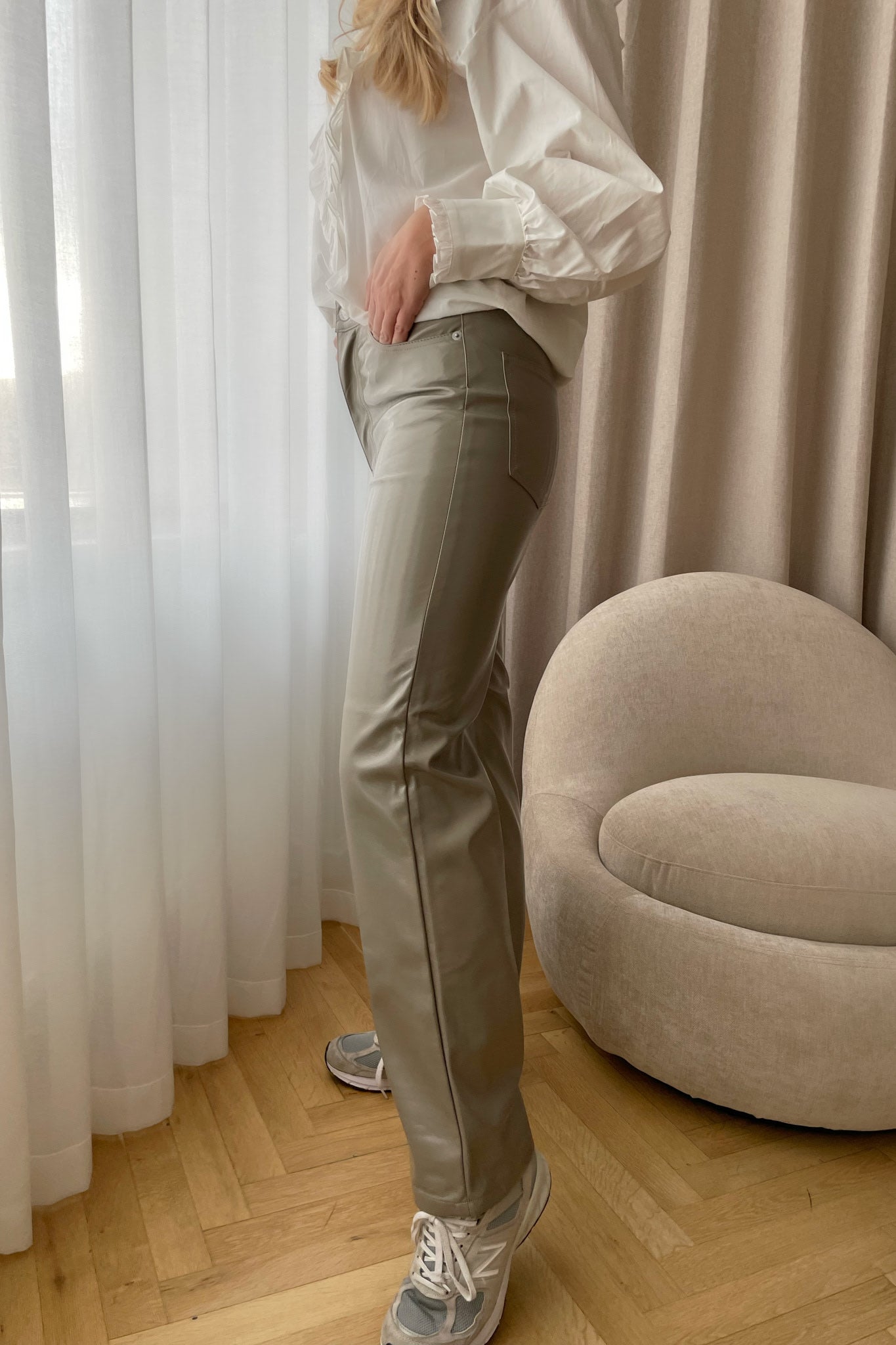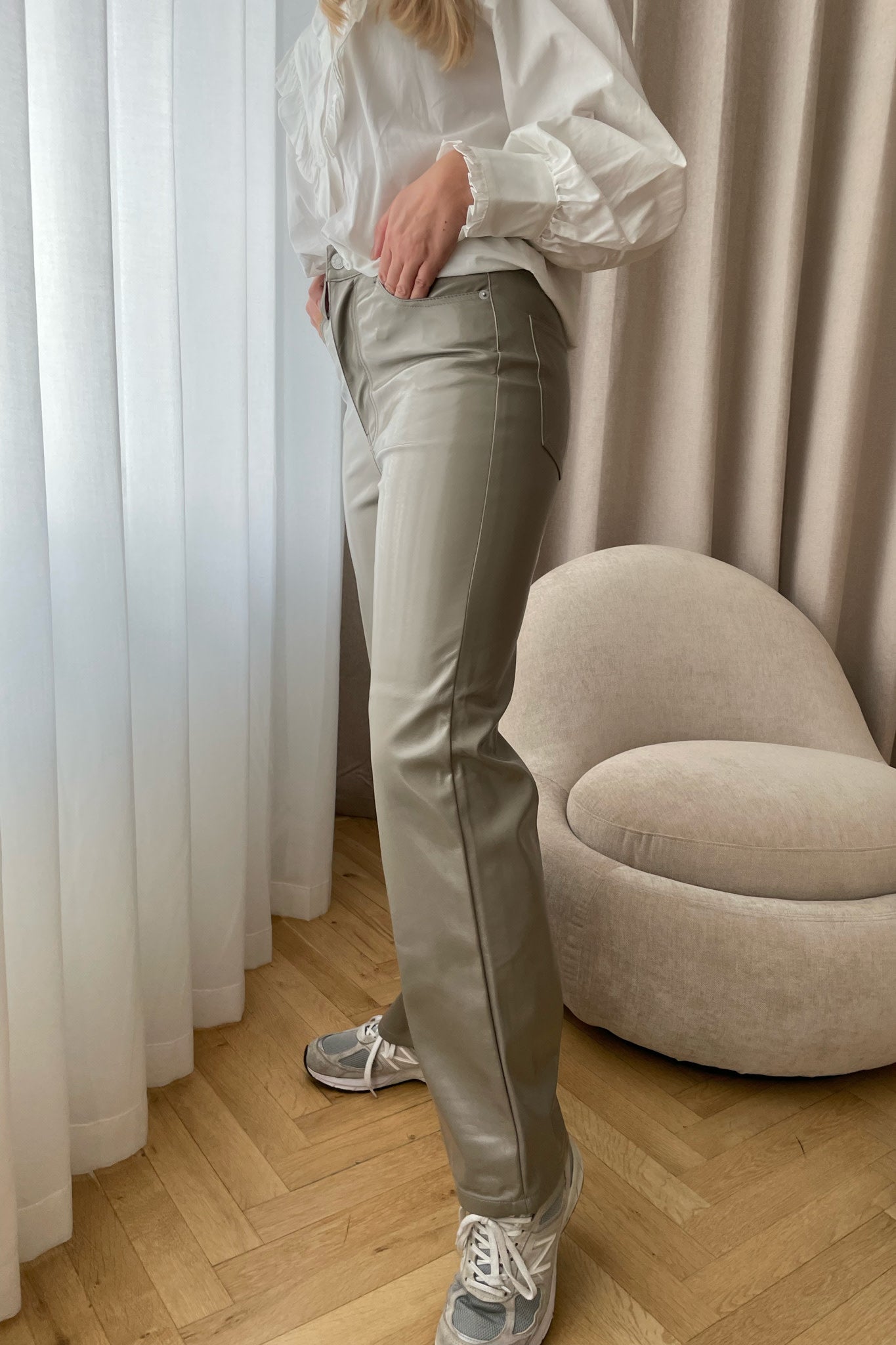 Cool imiterede skindbukser i shiny look.