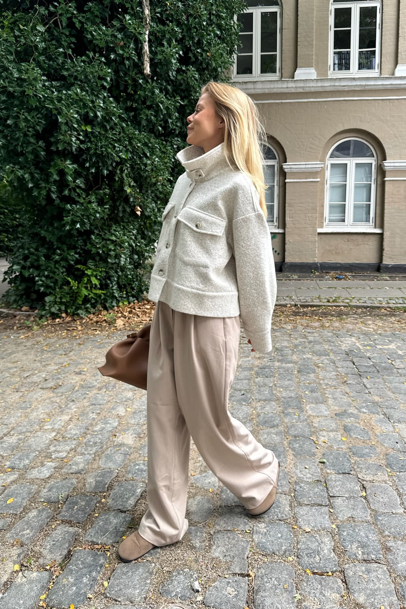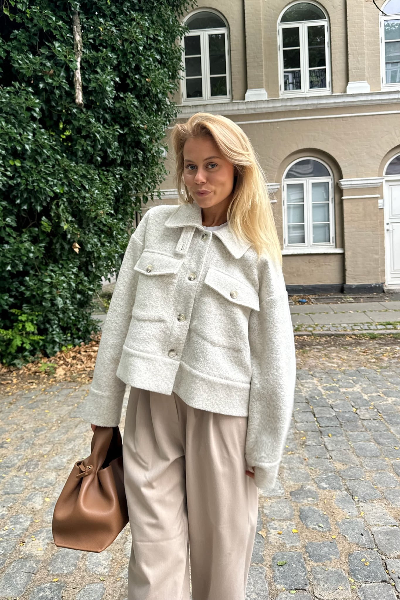 Sandfarvet jakke i Meleret stof.