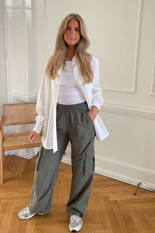 Behagelige cargo bukser med lommer på siderne og elastik ved anklen som kan spændes ind og ud.