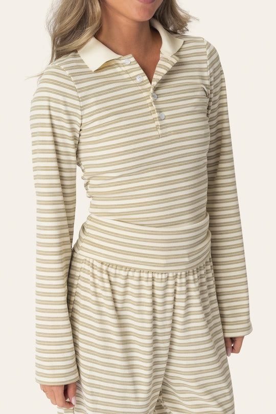 En dejlig poloshirt i gule striber. Skjorten har lange, lige ærmer og en figursyet pasform. Den har en hvid skjortekrave med fire knapper, så den kan knappes helt op til halsen eller bæres åben i en V-form halvvejs ned ad brystet. Poloshirten er lavet af et strækbart materiale.