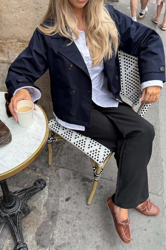 Elegant marineblå kort trenchcoat med en løs pasform. Trenchcoaten har naturfarvede knapper foran til lukning og stropdetaljer på ærmerne, som også lukkes med en knap. Den har to lommer i fra og uden bindebånd.