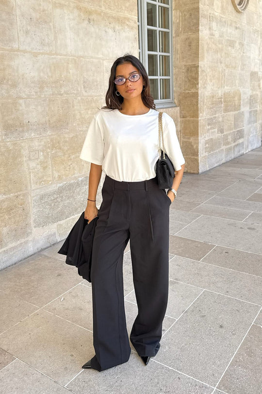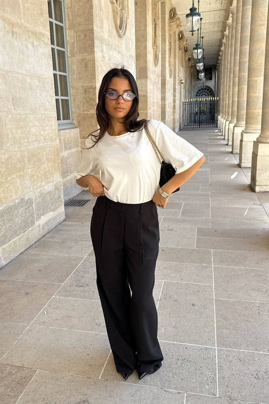 En basis hvid t-shirt med en løs pasform, korte ærmer og en rund halsudskæring. T-shirten har skulderpuder, der giver den et ekstra statement-look.