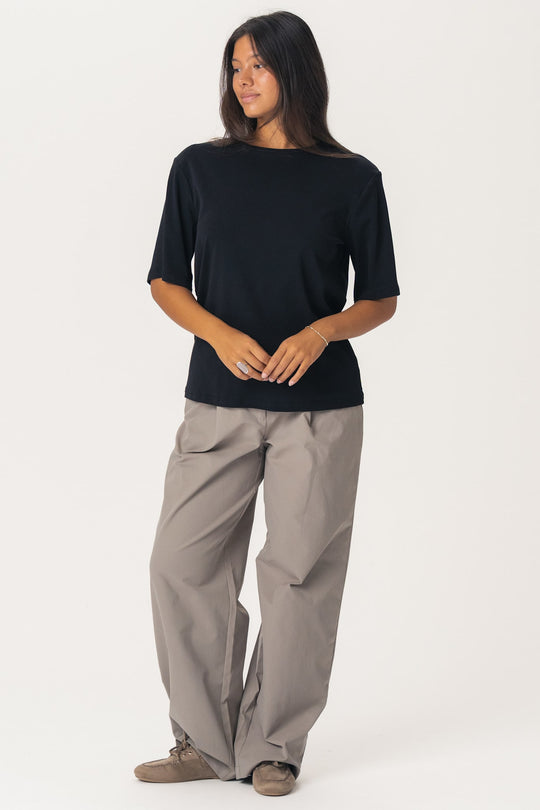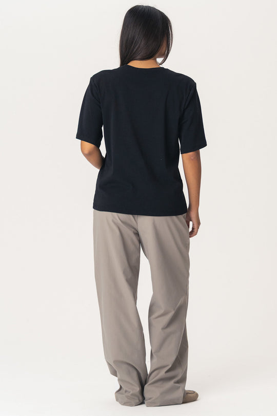 En sort basis-t-shirt med en løs pasform, korte ærmer og en rund halsudskæring. T-shirten har skulderpuder, der giver den et ekstra statement-look.