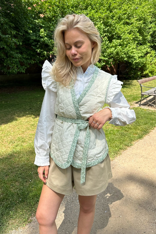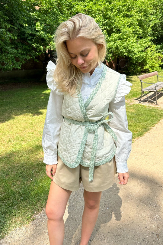 Hvid vest med grønt mønster, v-udskæring og et bindebånd omkring taljen.