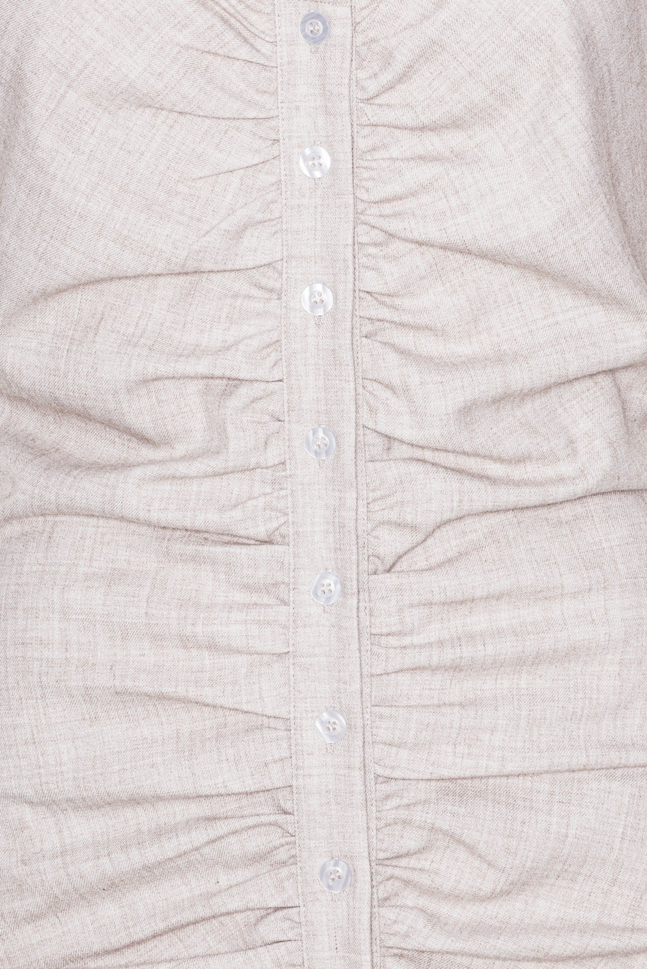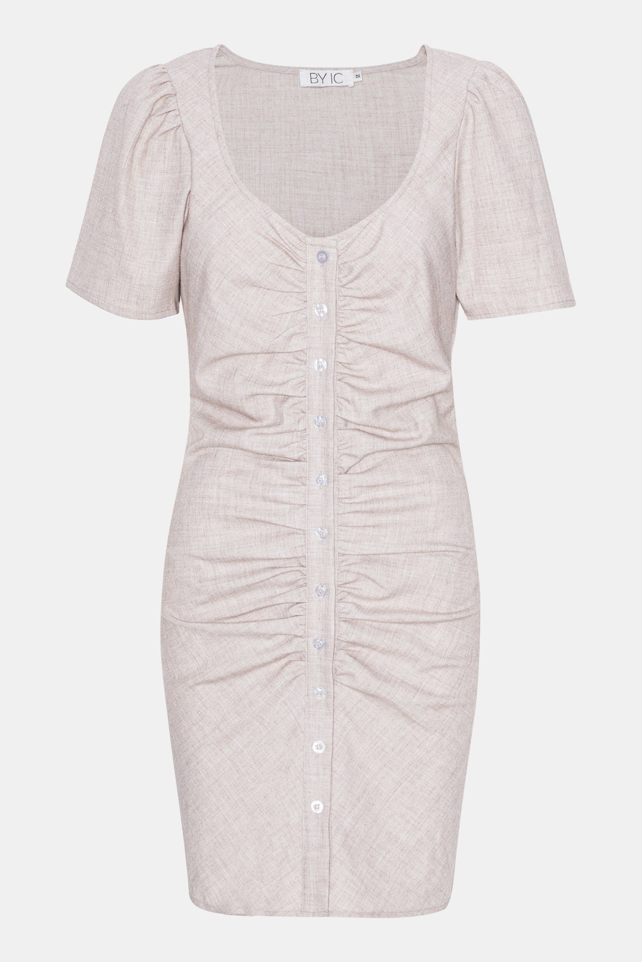 Mini kjole i beige med rynkedetaljer på fronten og knapper som lukkefunktion.