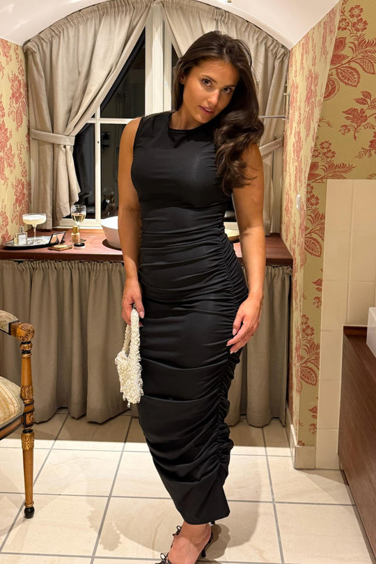 Elegant lang kjole i sort med en figursyet silhuet. Kjolen har korte ærmer, en rund halsudskæring og er lavet af et strækbart materiale. Kjolens kanter har flæsedetaljer, og rynkekanten i siderne giver dig mulighed for at justere længden for et kortere look.