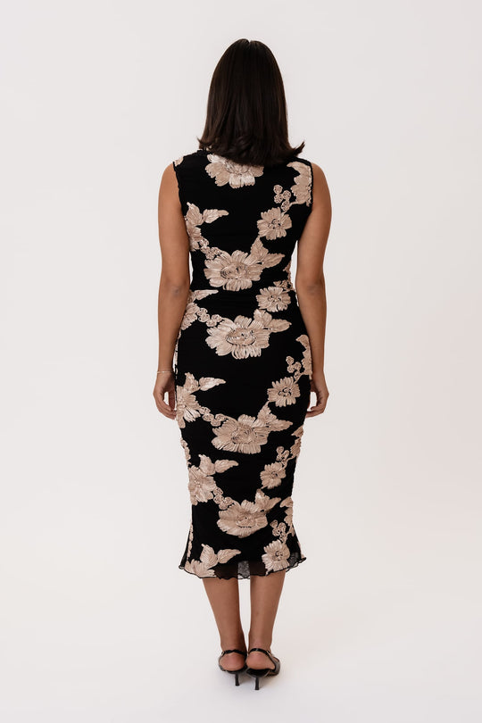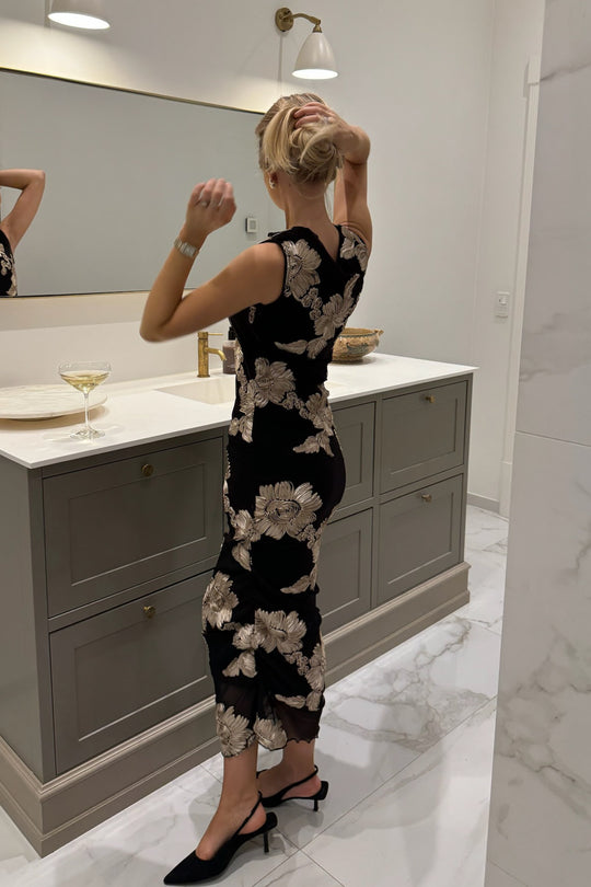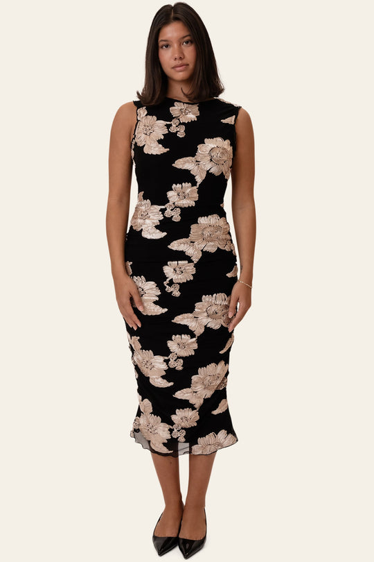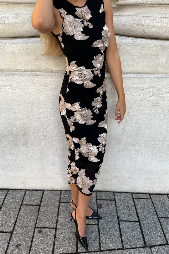 Elegant lang kjole i sort med en figursyet silhuet. Kjolen har korte ærmer og rund halsudskæring. Den er prydet med beige 3D-blomsterdetaljer overalt, hvilket tilføjer ekstra karakter til designet. Kjolens kanter har flæsedetaljer, og rygningen i siderne giver dig mulighed for at justere længden for et kortere look. Kjolen er lavet i en strækbar kvalitet.