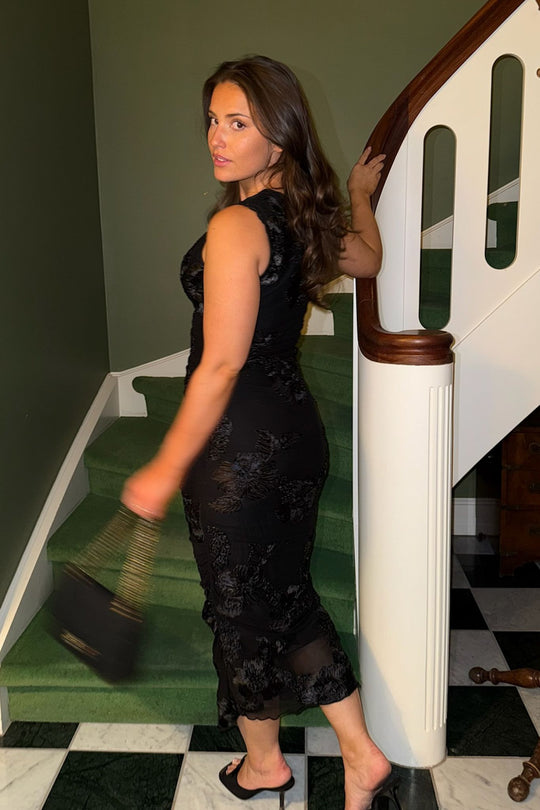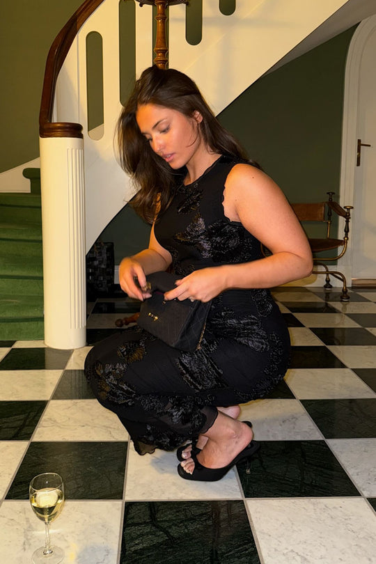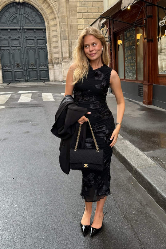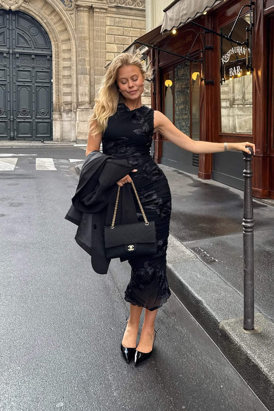 Elegant lang kjole i sort med en figursyet silhuet. Kjolen har korte ærmer og rund halsudskæring. Den er udsmykket med 3D-blomsterdetaljer overalt, hvilket tilføjer ekstra karakter til designet. Kjolens kanter har flæsedetaljer, og rygningen i siderne giver dig mulighed for at justere længden for et kortere look. Kjolen er lavet i en strækbar kvalitet.