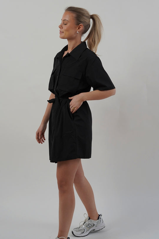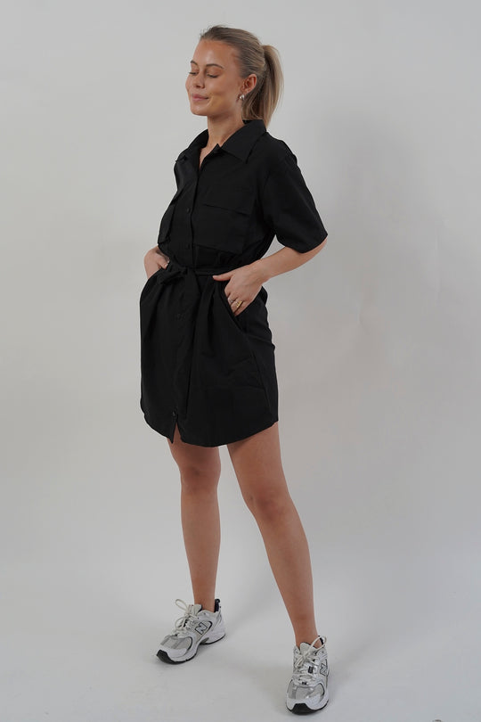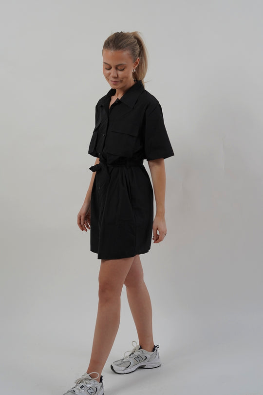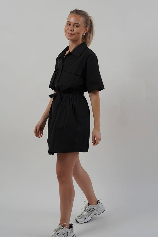 Sort kjole med lommer på brystet og et bindebånd omkring taljen.