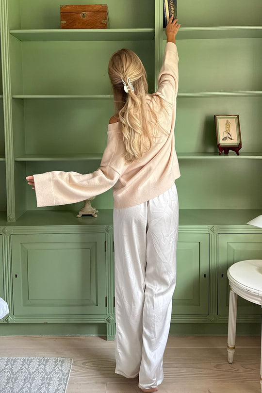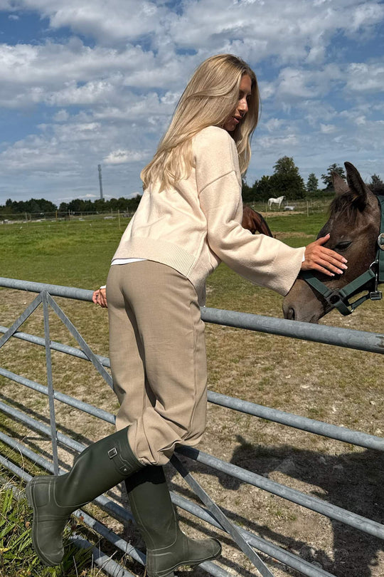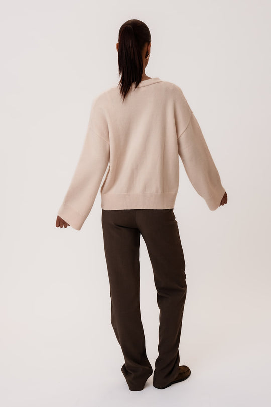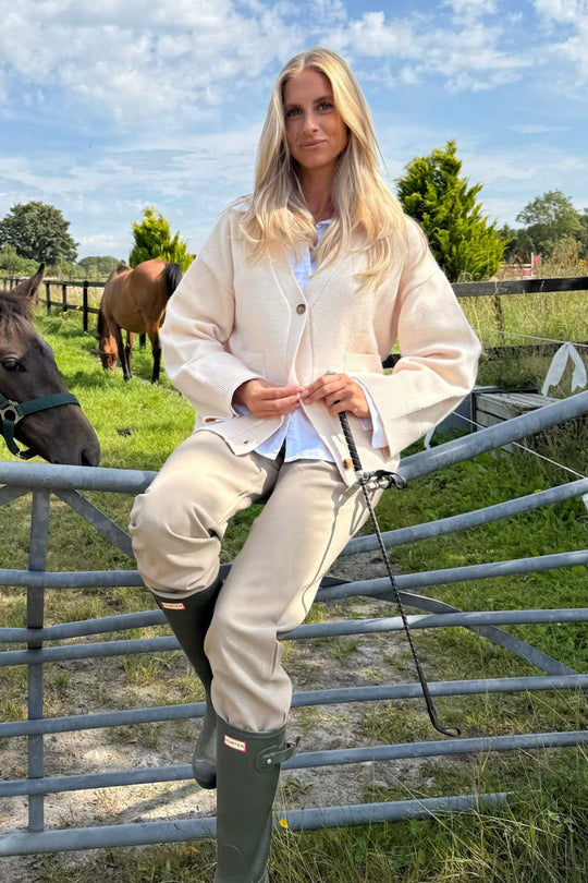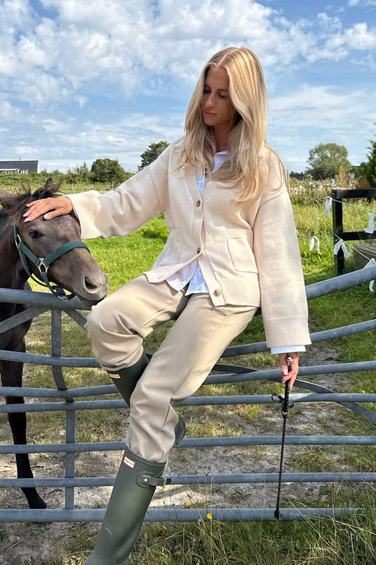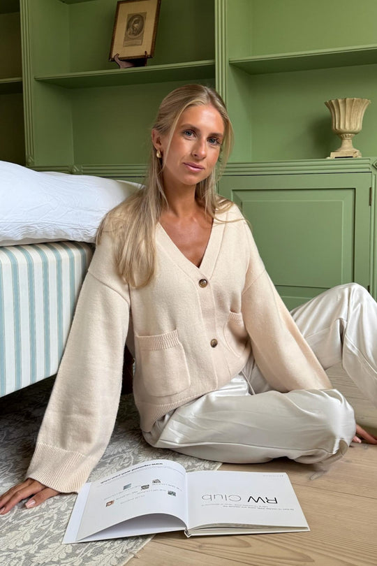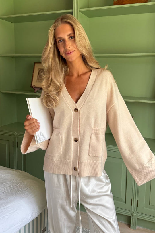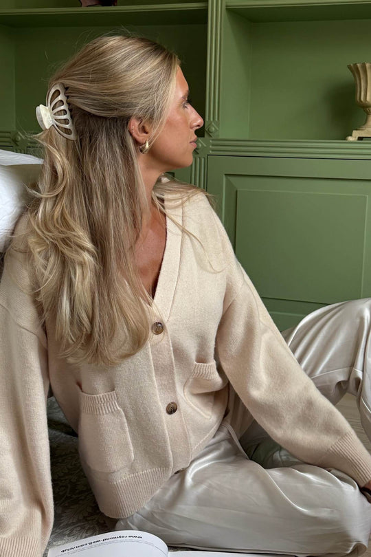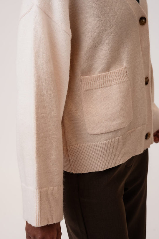 Blød boxy cardigan i uldblanding med ribdetaljer. Den har to store frontlommer og 3 knapper som lukning.