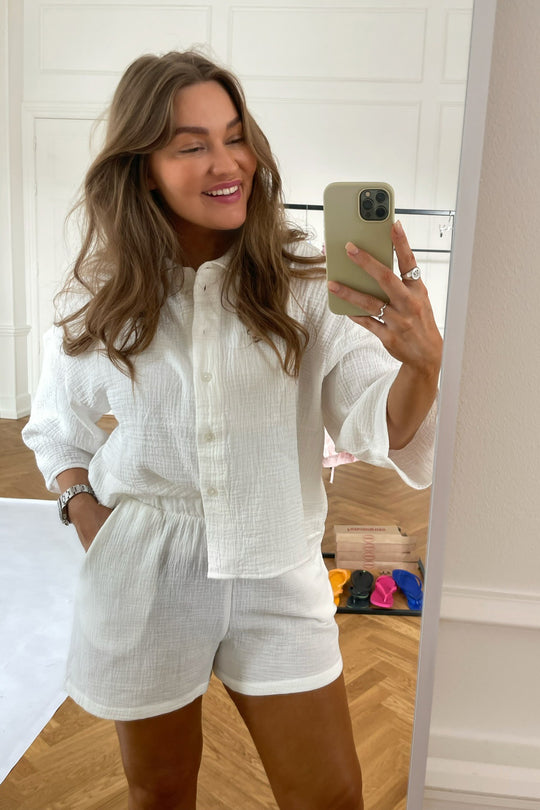 De helt perfekte hvide skjorte til sommer med knapper og korte ærmer, match den med Natali shorts.
