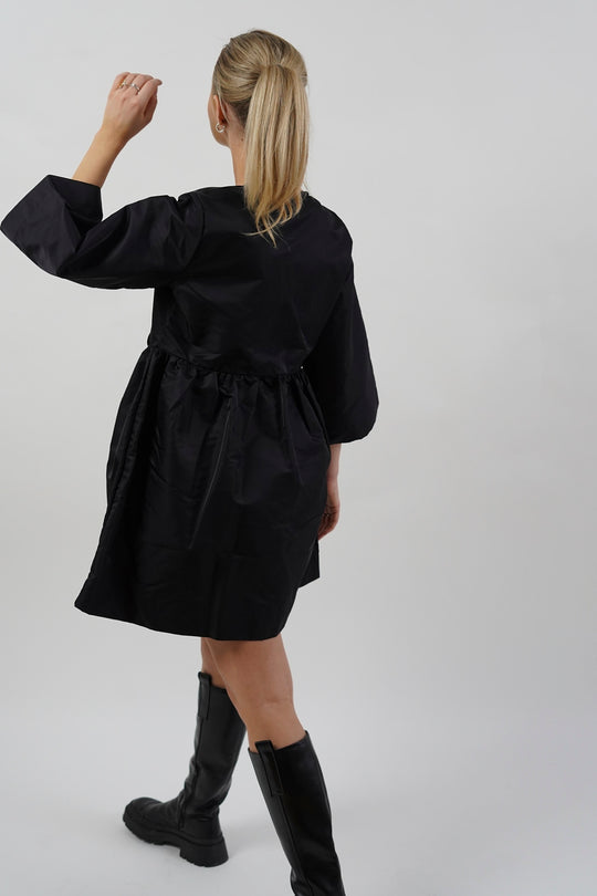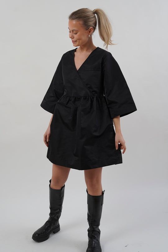 Smuk kjole i et skinnende materiale og med fake slå-om detalje.