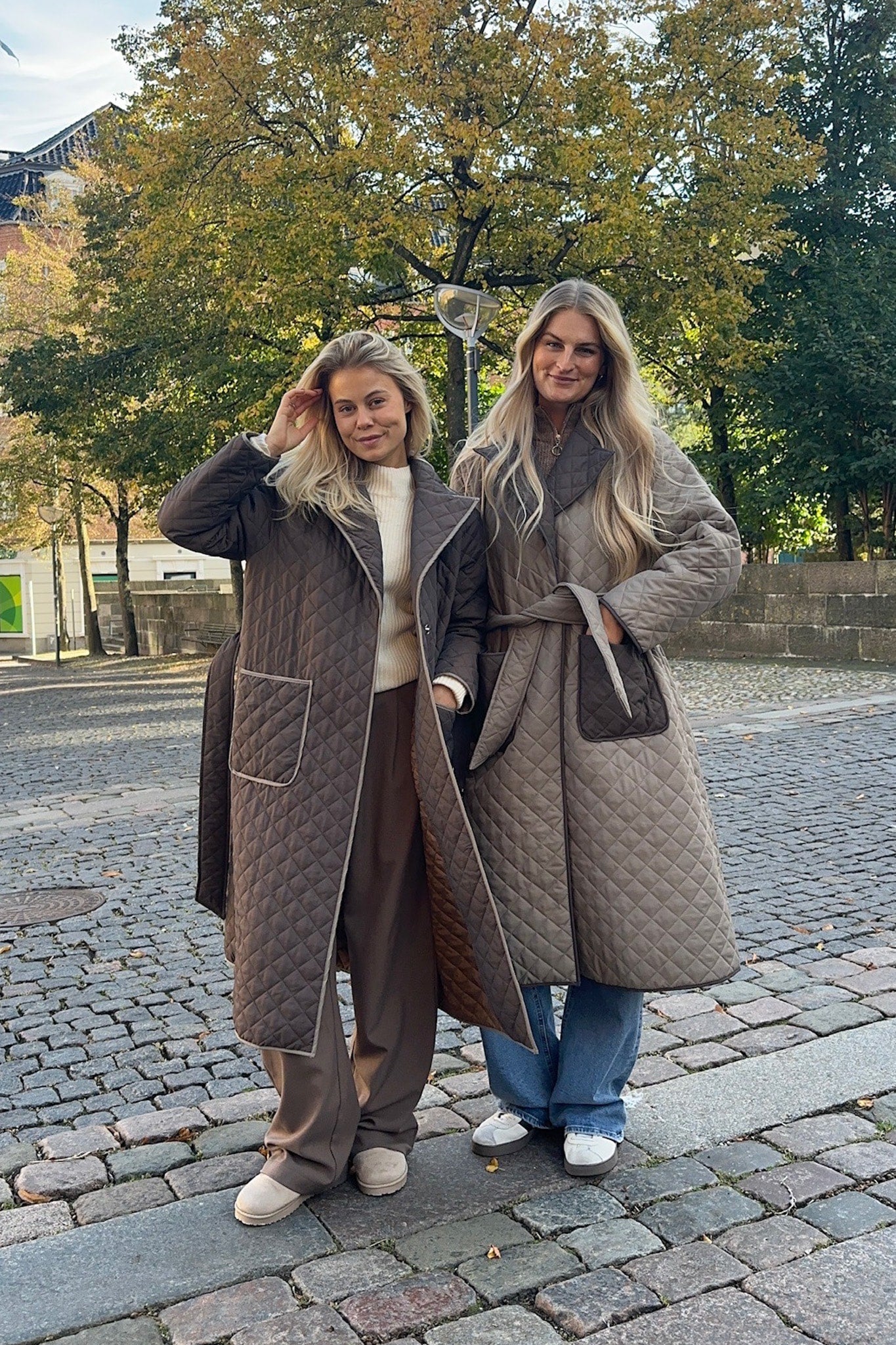 Army quilted jakke med to brune lommer, krave og et bælte. Perfekt for efterår.
