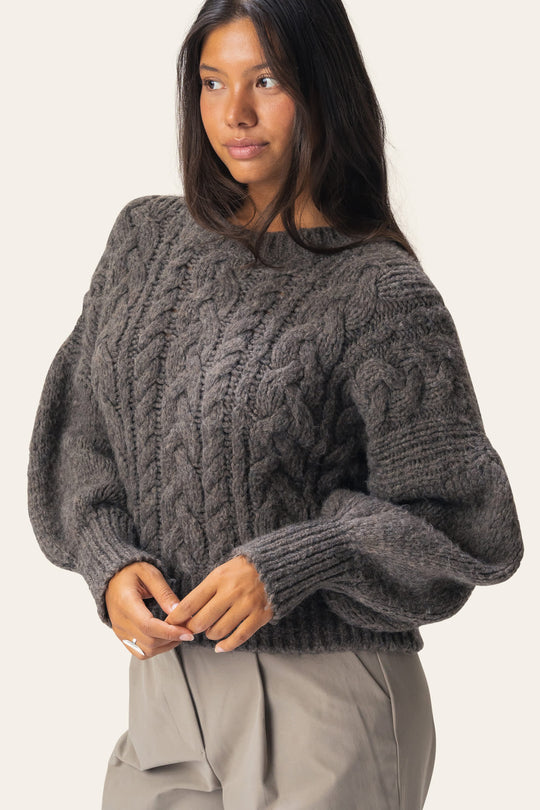 Hyggelig chunky striktrøje lavet af tykt garn. Den har lange ærmer med brede ribmanchetter, som skaber en let puffet silhuet. Kroppen har en afslappet pasform og er dekoreret med smukke snoningsdetaljer foran. Afsluttes med en rund halsudskæring, indrammet af en bred ribkant for et markant og klassisk udtryk.