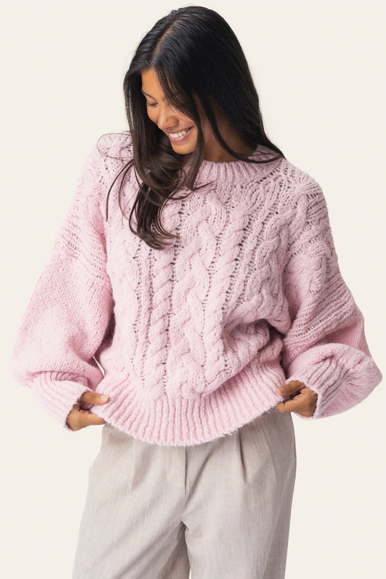 Hyggelig chunky striktrøje lavet af tykt garn. Den har lange ærmer med brede ribmanchetter, som skaber en let puffet silhuet. Kroppen har en afslappet pasform og er dekoreret med smukke snoningsdetaljer foran. Afsluttes med en rund halsudskæring, indrammet af en bred ribkant for et markant og klassisk udtryk.