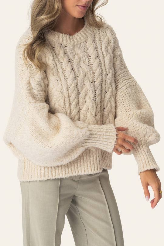 Hyggelig chunky striktrøje lavet af tykt garn. Den har lange ærmer med brede ribmanchetter, som skaber en let puffet silhuet. Kroppen har en afslappet pasform og er dekoreret med smukke snoningsdetaljer foran. Afsluttes med en rund halsudskæring, indrammet af en bred ribkant for et markant og klassisk udtryk.