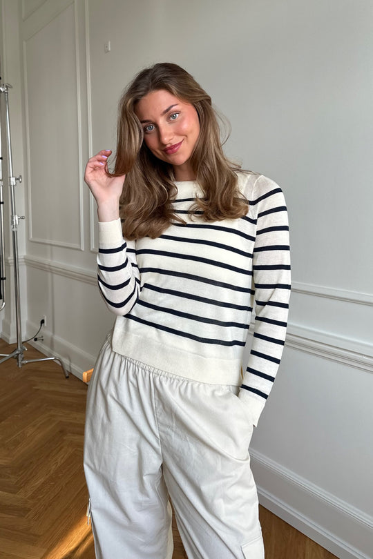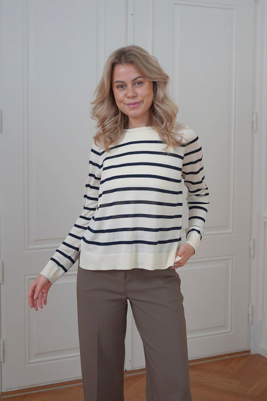 Beige pullover med sorte striber, lange ærmer og en løs pasform.
