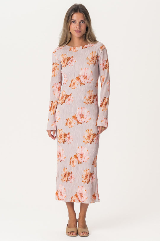 Smuk plissékjole i blomsterprint. Kjolen har lange ærmer og en rund halsudskæring, begge udsmykket med fine flæsedetaljer. Den har slidser i begge sider, hvilket giver designet et elegant touch. Kjolen er lavet af et strækbart materiale.