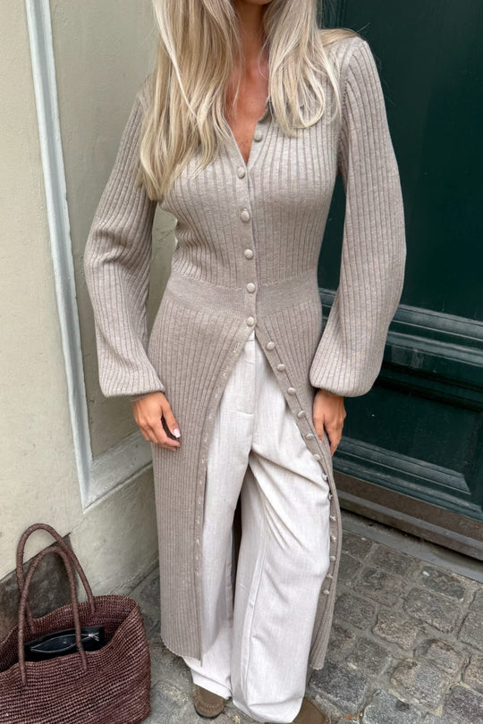 En smuk ribbet strikkjole i en blød lysebrun nuance med lange ærmer. Dette elegante stykke kjole har en figursyet silhuet med en defineret talje for en flatterende figur. Kjolen er færdig med strikbeklædte knapper, der kan åbnes helt ned foran. Under knaplukningen er en lille slids, der giver et diskret og sofistikeret touch. Ærmerne er færdige med elastiske ribkanter, der giver dem et blødt, pufet look. Ved halsudskæringen er kjolen afsluttet med en klassisk krave for et raffineret finish. Kjolen er lavet af et strækbart materiale.
